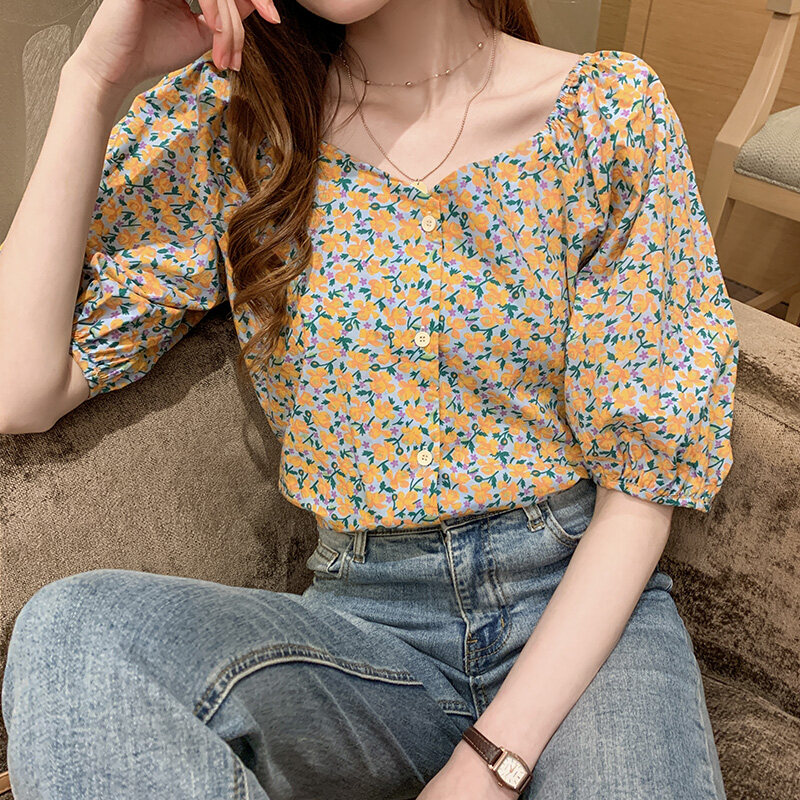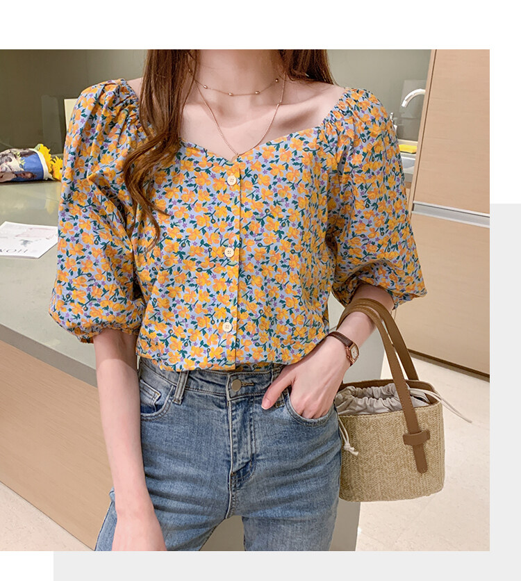 AFEG Floral Print Korean Lantern Short Sleeve Casual Blouse Women Elegant Summer Top Purple Yellow