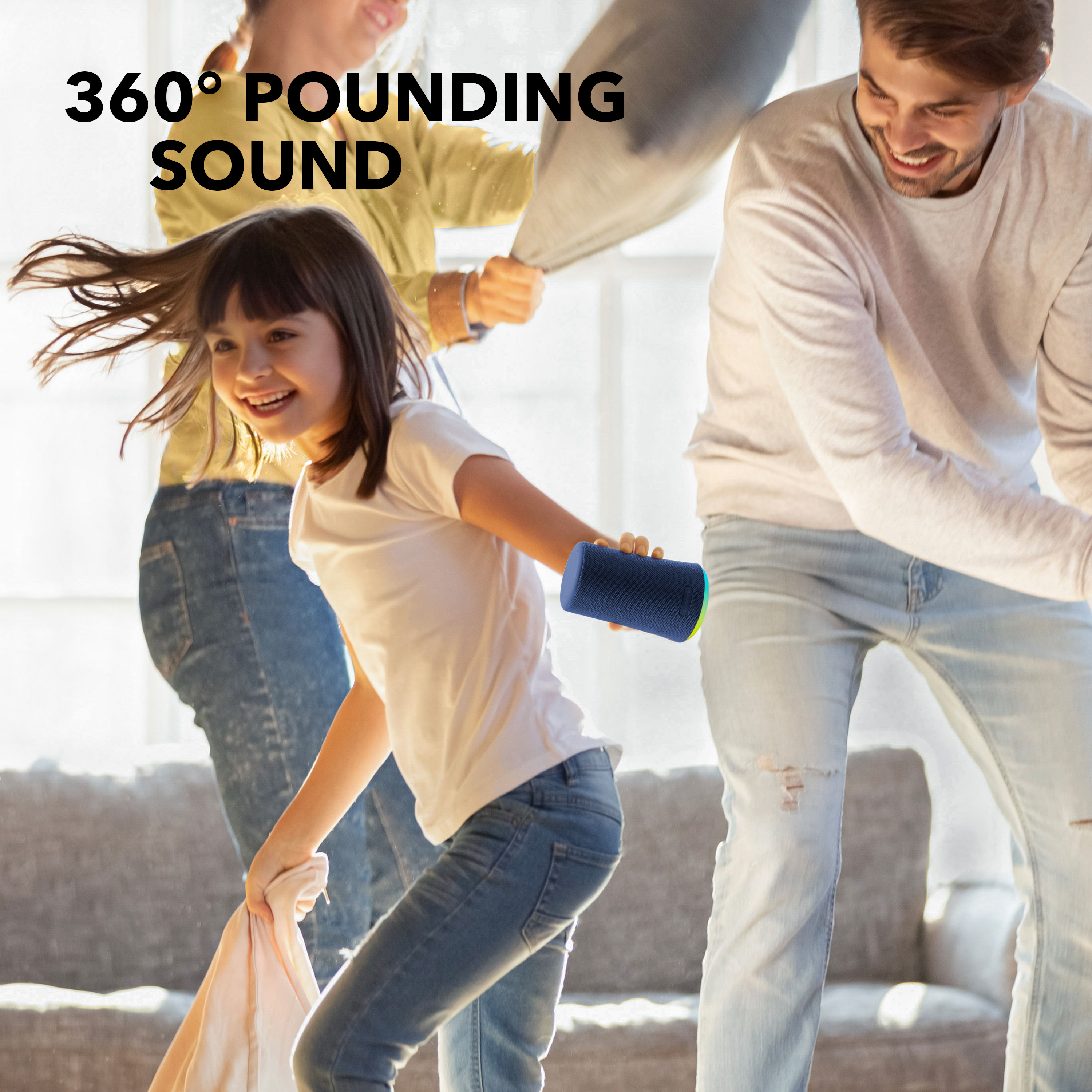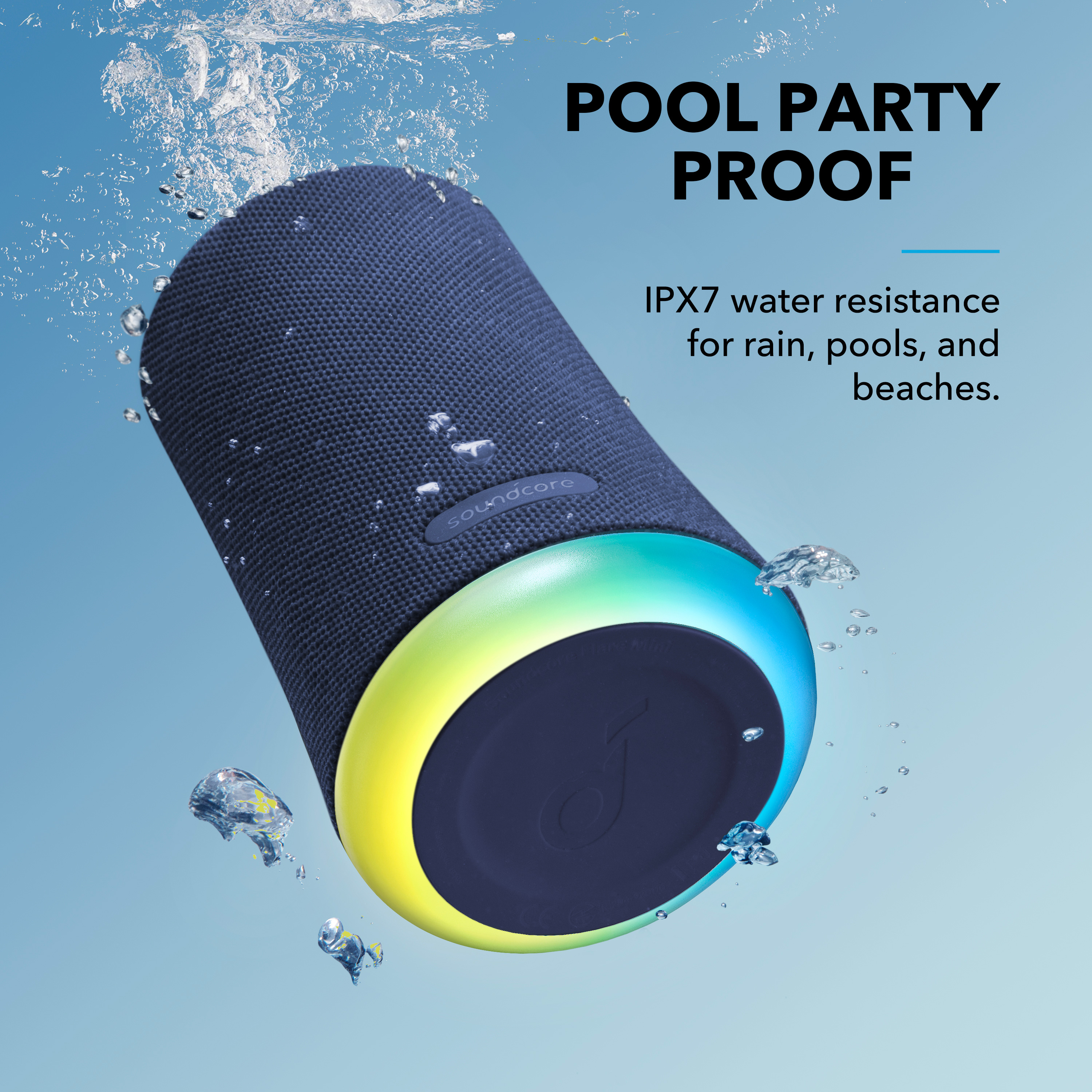 with IPX7 Waterproof, Bigger Bass, Ambient LED Light, 12-Hour Playtime. Intense 360° sound drops from back-to-back neodymium drivers-all powered by BassUp technology.