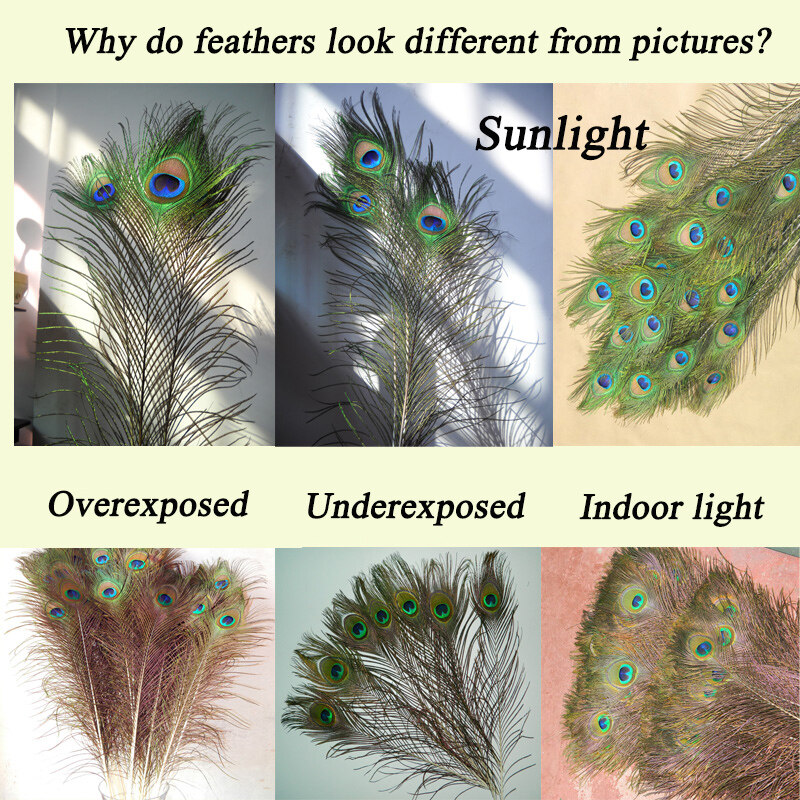 Peacock feathers come from legal farms, natural feathers. All feathers are sterilized by high temperature. Under different lighting conditions, the feathers have different colors, and the feathers that are photographed under sufficient light look better.