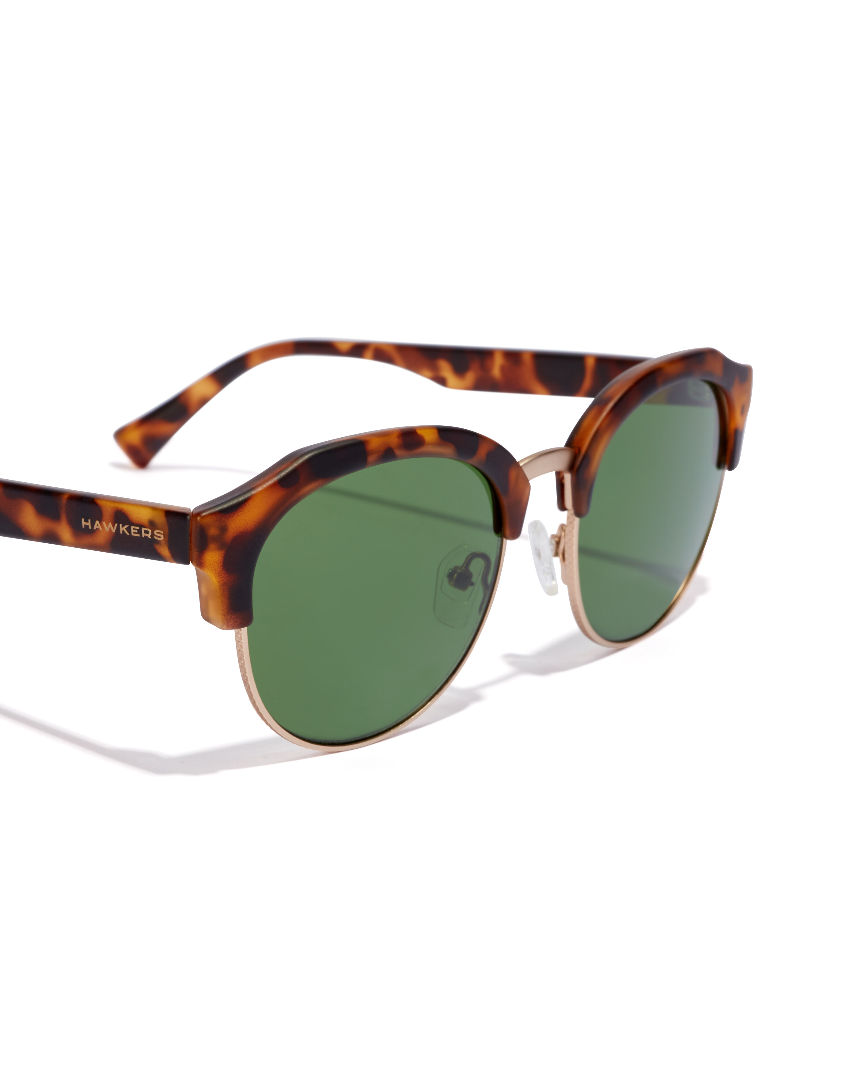 It combines bottle green lenses and round frame in polished Havana print with bridge and gold metal bottom rings. Lenses of Eastman, one of the World leaders in copolyester technology. Respects the environment and gives a unique balance between clarity and resistance Category 3 lenses with UV400 protection which offer superior antiglare protection Sunglasses made from EMSTR90, considered the best nylon in the world for eyewear frames, providing more flexibility and resistance Nickelfree stainless steel rim for corrosion resistance and much more strength Antislip, antiallergy silicon nose pads, fixed with an exclusive Hawkers emblem in stainless steel. Nose pads designed with distinctive geometric lines 5 barrel hinge for improved grip and durability Wider design of the earpiece for better ergonomics and comfort 45º cut to soften the join between frame and temple, giving perfect continuity Size: Front 13,7 cm, Height 4,97 cm, Temples 14,5 cm, Bridge 2 cm Includes: Microfiber cover, box and set of decorative stickers