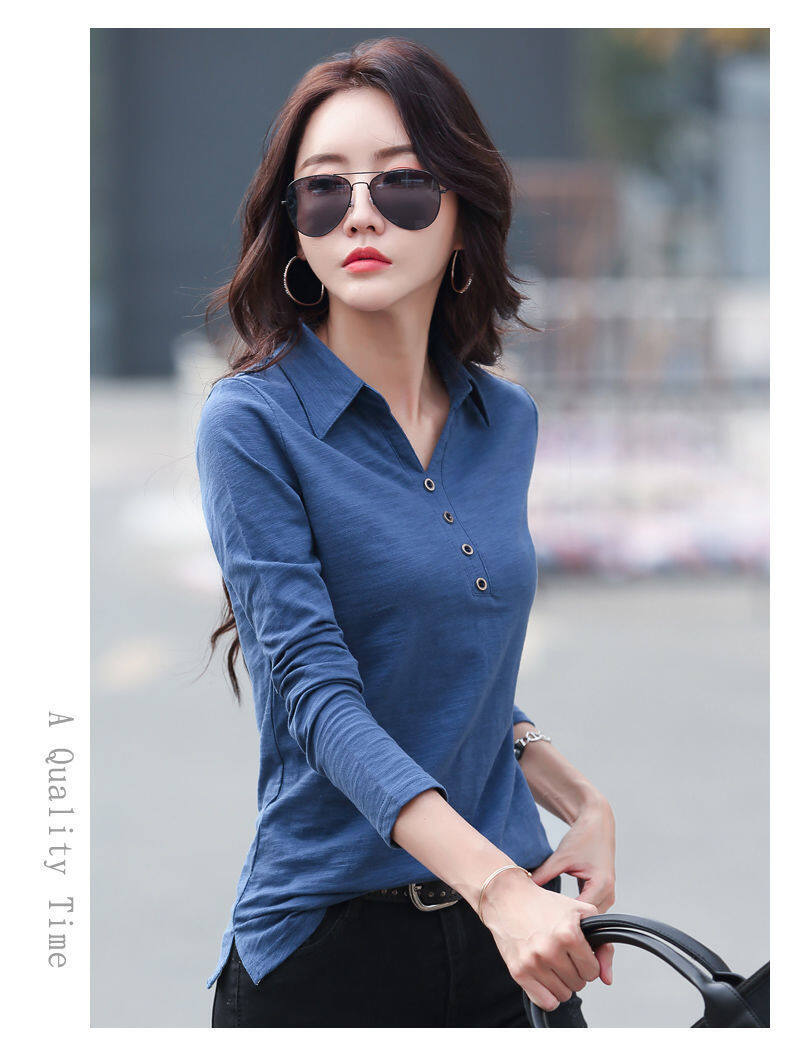 Spring and Autumn New Korean Casual Polo shirt Women Long sleeve Stand Collar T-shirt Loose Plain V neck Comfortable Black t shirts Female Shirts Bottoming Tops Free shipping