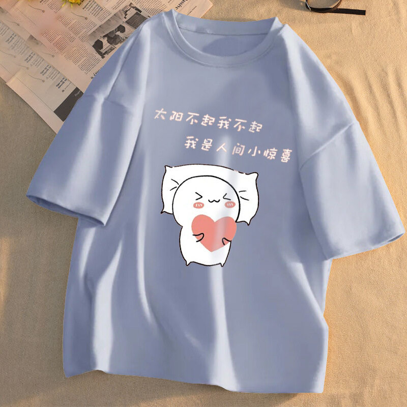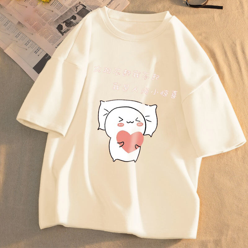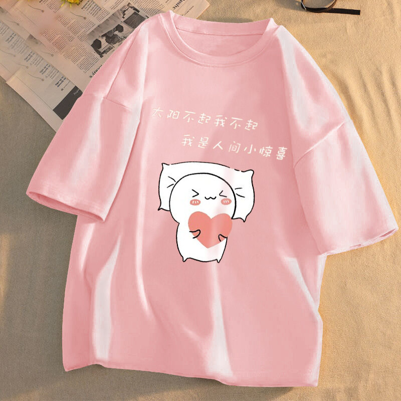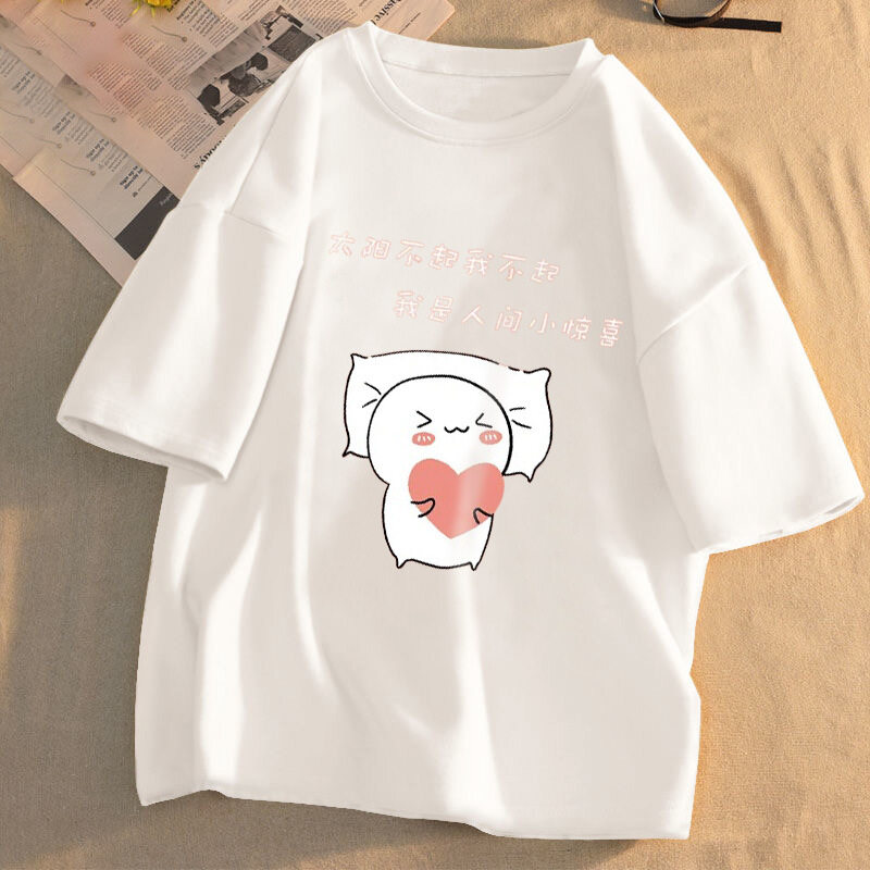 Women Clothes Summer T-Shirt Plus Size Cartoon Print Loose Short Sleeves Round Neck Cute Sweet Korean Style Casual All-match Blouse for Student