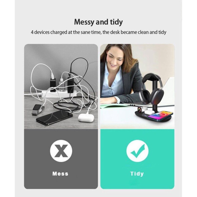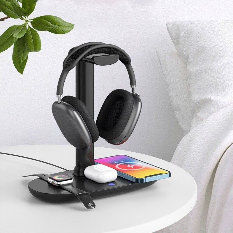 DESKTRON 4-IN-1 Wireless Charging Station. 15W Qi Fast Charging Dock Headset Rack. Headphone Display Rack Compatible for iPhone 13, Airpods iWatch and other phone with wireless charging function.