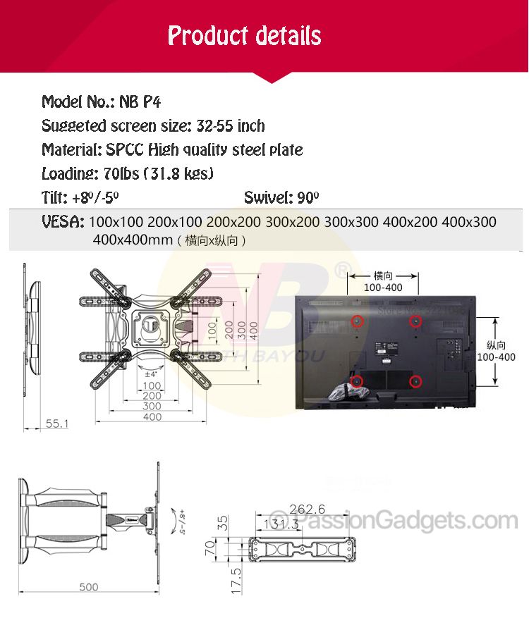 NB P4 32-55inch TV Wall Mount Full Motion North Bayou Bracket Mounts DF400 DF-400