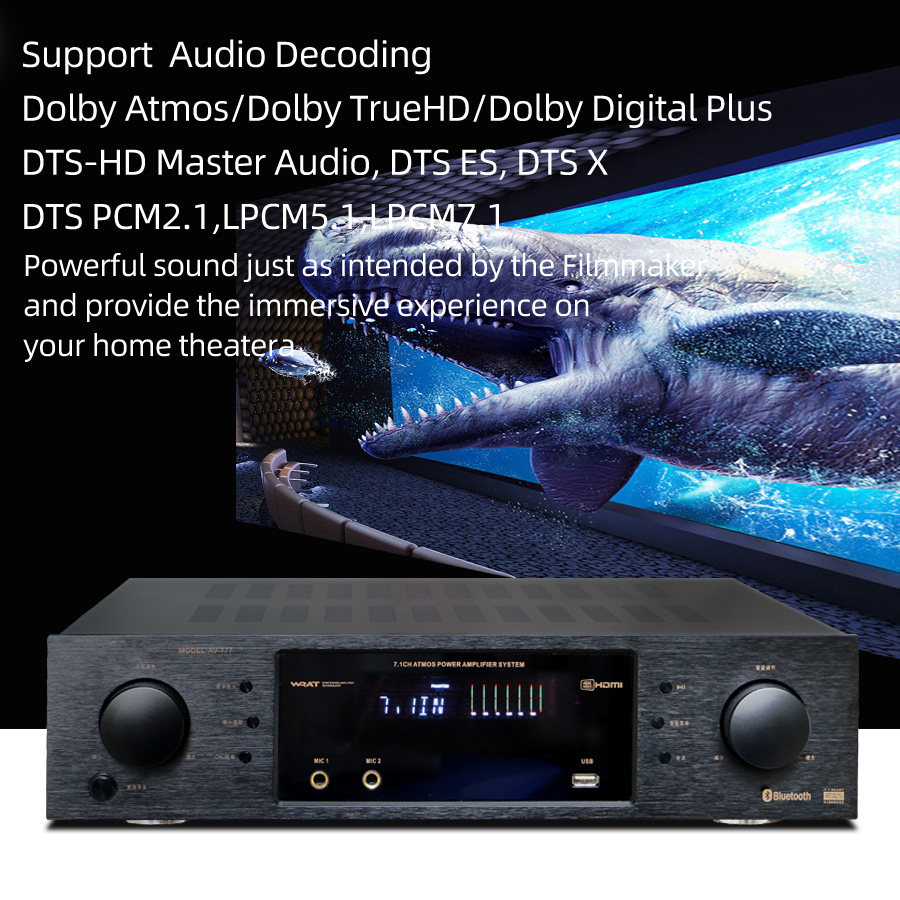 Support Dolby Atmos/Dolby TrueHD/Dolby Digital Plus/DTS X/DTS-HD. Upgrade your home theater with the AV777 provides a truly immersive 3D audio experience, enjoy seamless compatibility with the latest HD and Ultra HD TVs, Blu-ray players and game consoles.