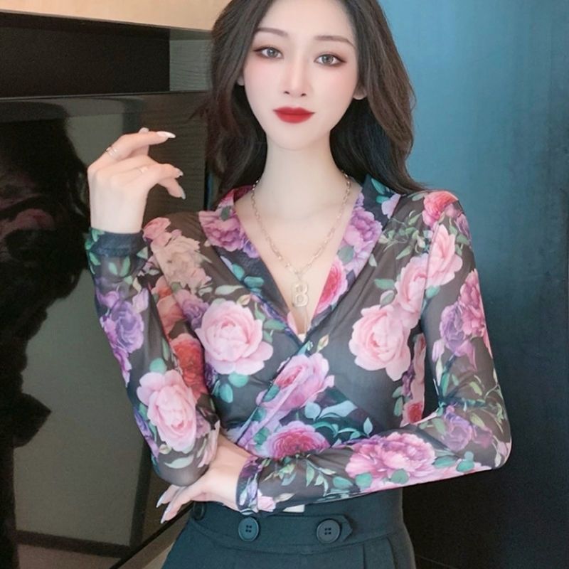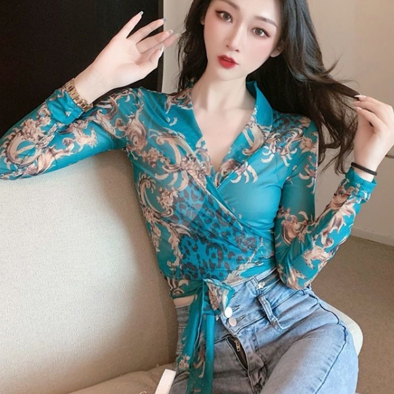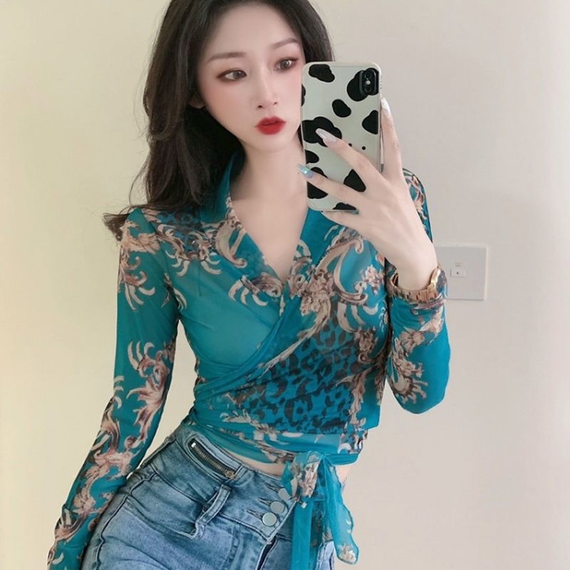 EDQRDQ Women's Floral Print V Neck Self Tie Waist Wrap Crop Top Long Sleeve Mesh Sheer Blouse