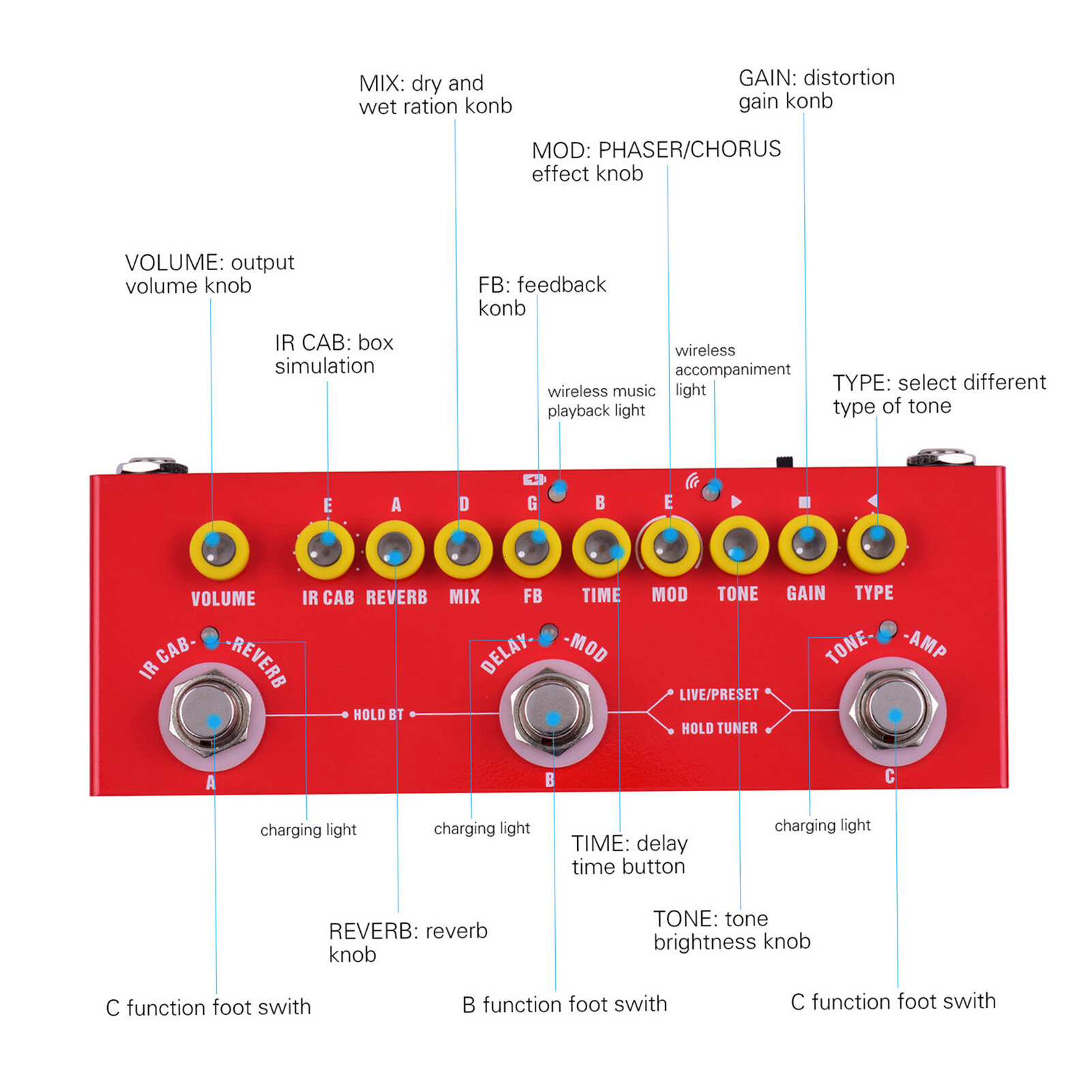 Portable Multi-functional Electric Guitar Combined Effects Pedal Built-in Bat-tery with Phone Recording Wireless Music Playback Audio Interface Function