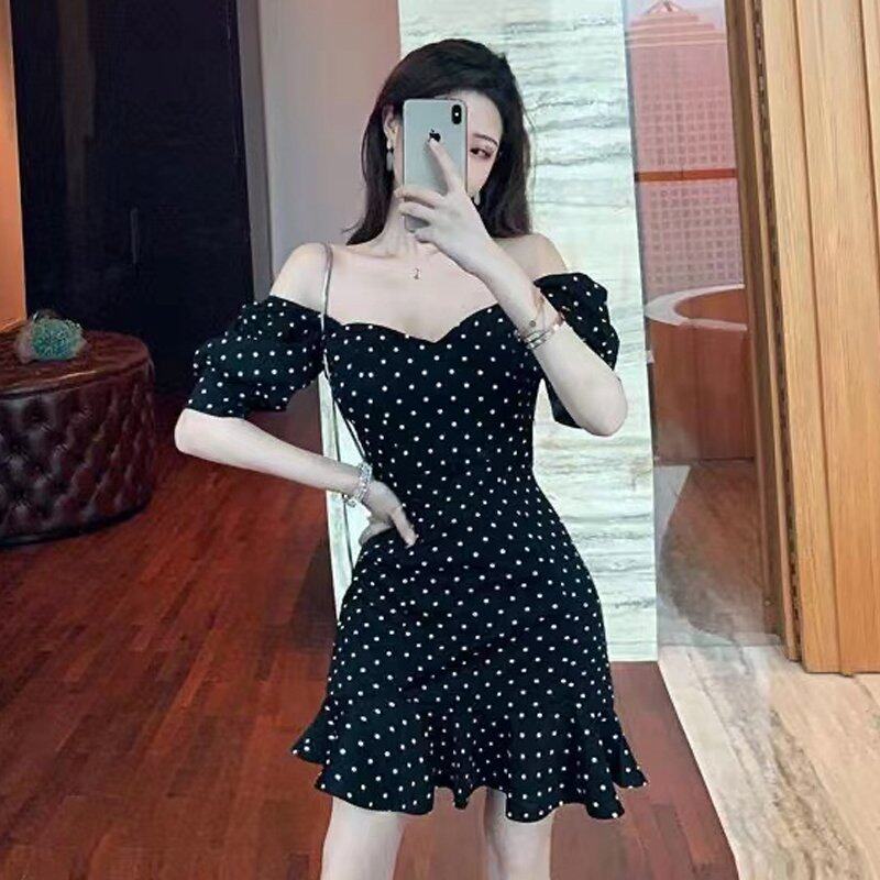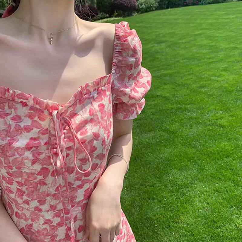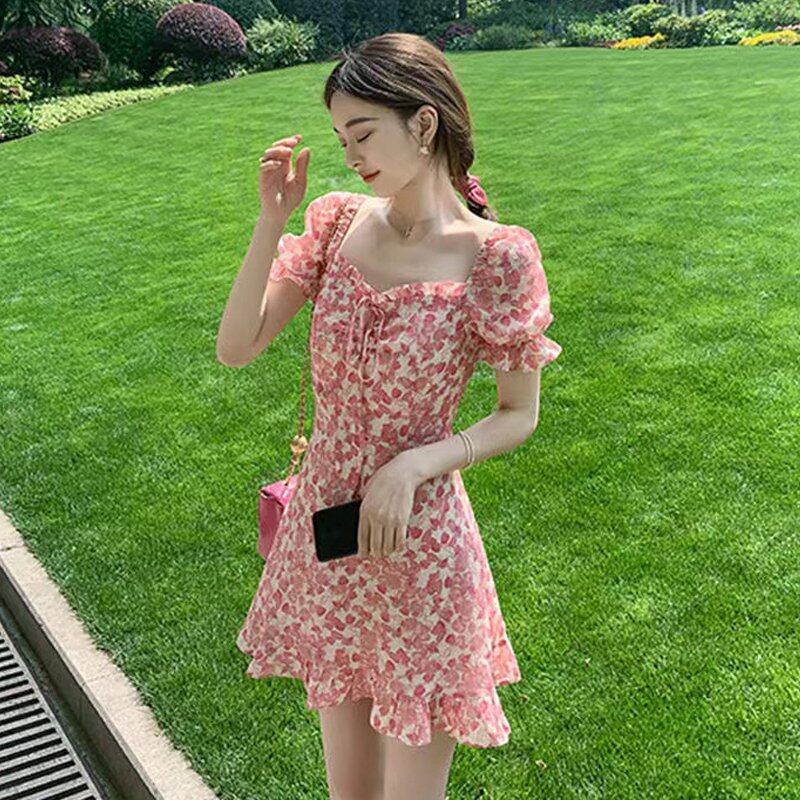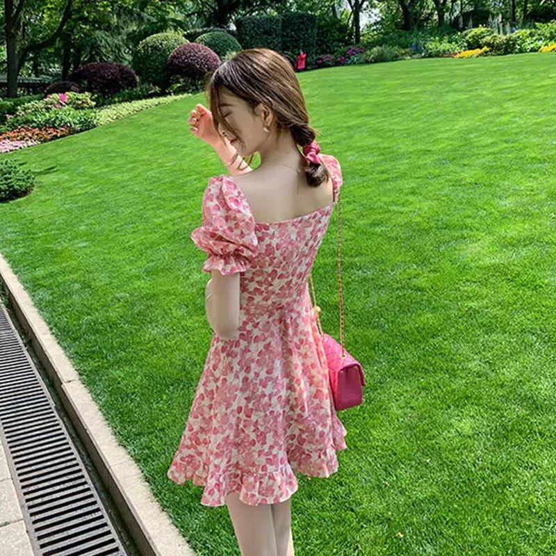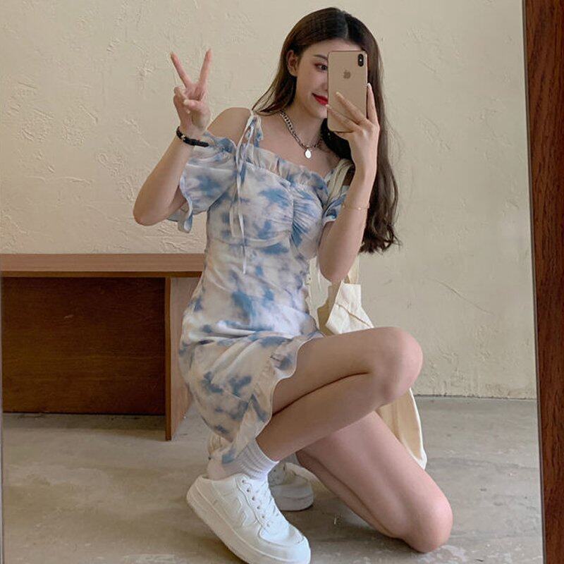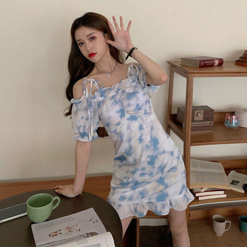 INWPLLR Summer Dating Mini Dress Women Fashionable Square Collar Puff Sleeve Dresses Fairy Tie Dye Female Dress