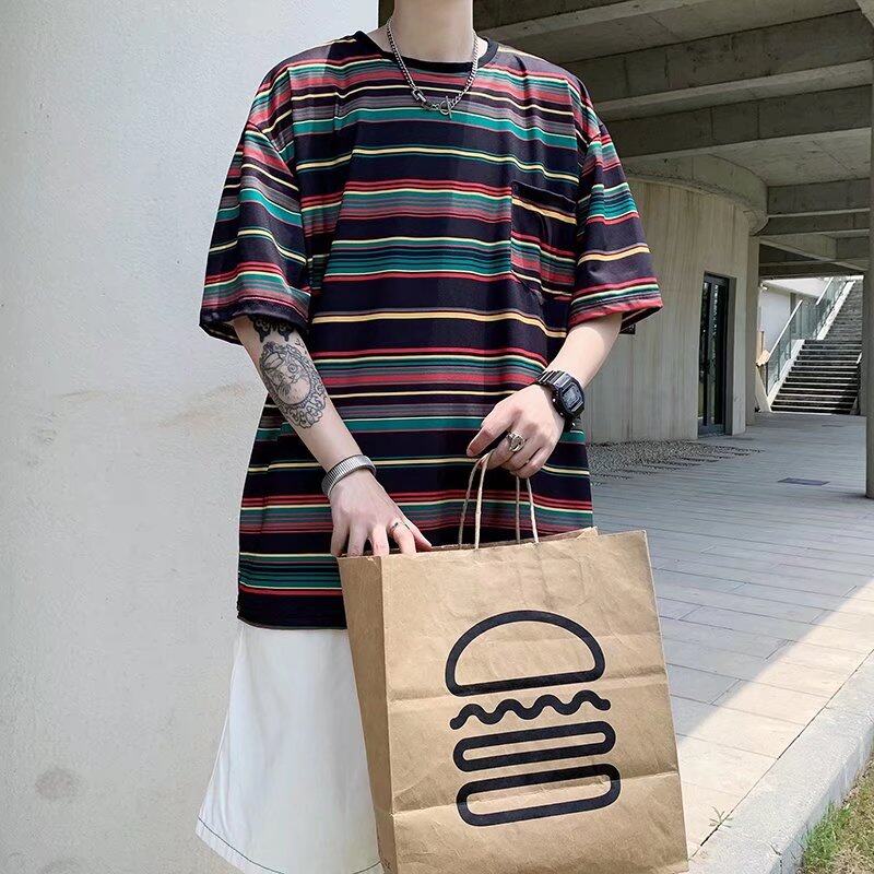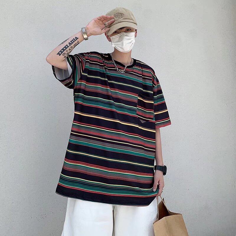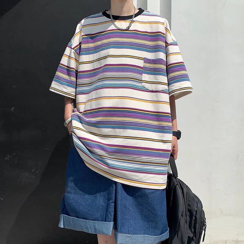 t shirt Men Korean Street Style Oversize Short Sleeve Fashion Tops Casual Stripe Print t-shirt