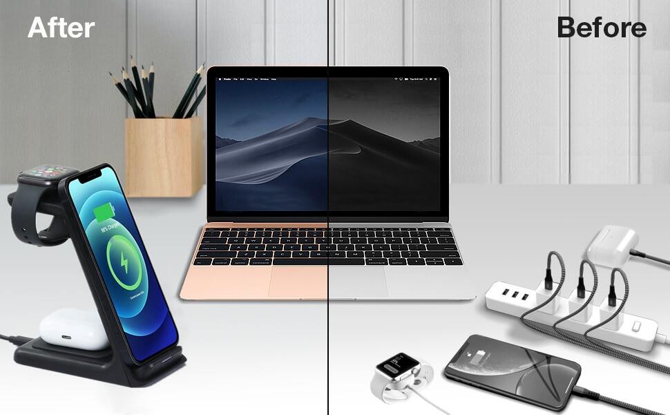 WITH DUAL CHARGING COIL DESIGN:The 2021 new 3 in 1 wireless charging station can provide a more stable charging experience without the intermittent charging or overheating caused by mismatch. Improved the charging speed, eliminate the hassle of finding the "Best Location".