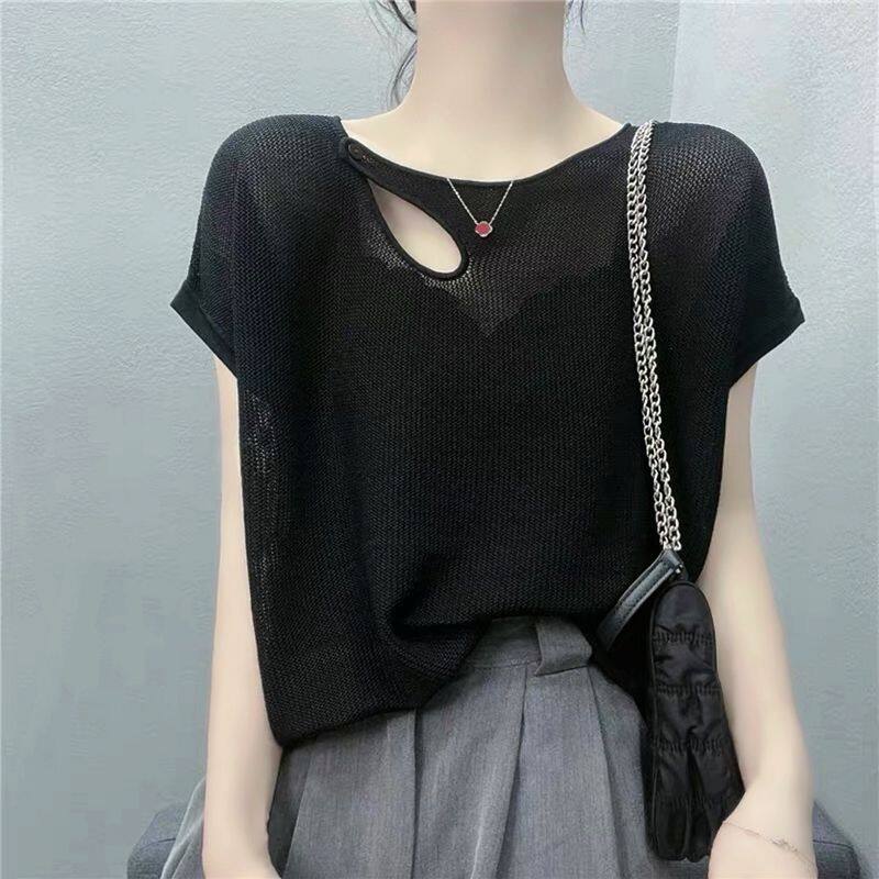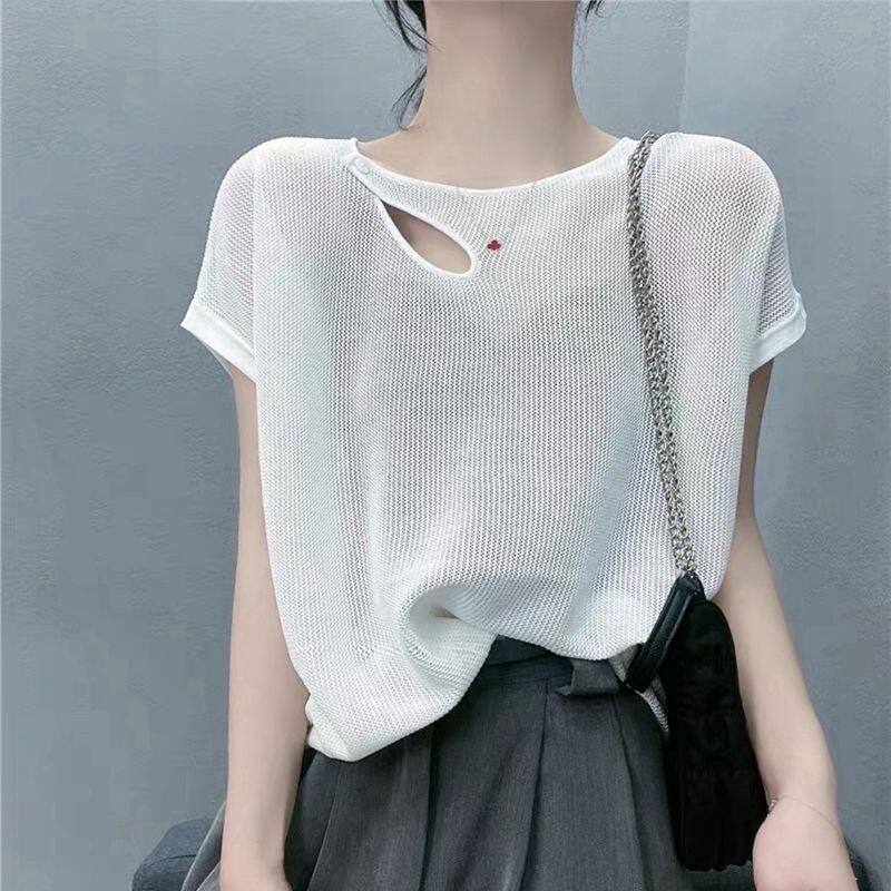 2022 Summer New Sexy Hollow Ice Silk Sweater Women's Korean Version All-match Solid Color Round Neck Short-sleeved T-shirt Top