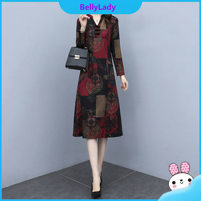 Women V Neck Dress Stylish Retro Printing Long Sleeves Large Size Loose Casual Dress