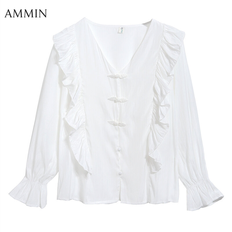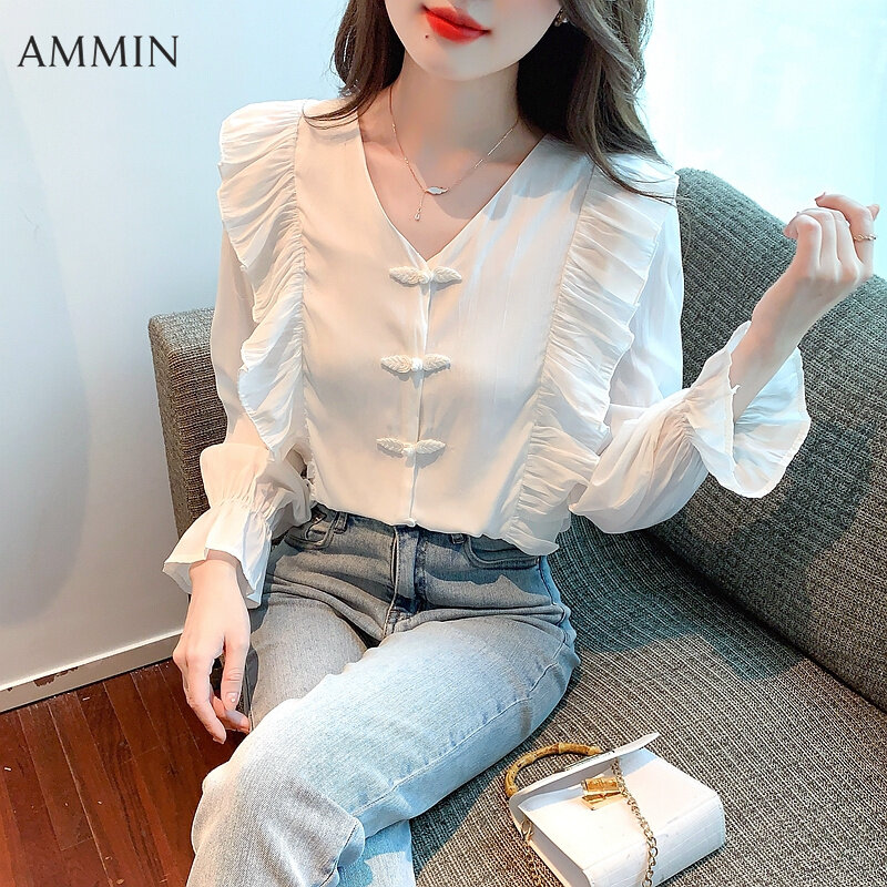 AMMIN 2022 Autumn new sweet chic high-grade white chiffon shirt Korean-style fashion temperament V-neck ruffle lantern sleeve chiffon top For women