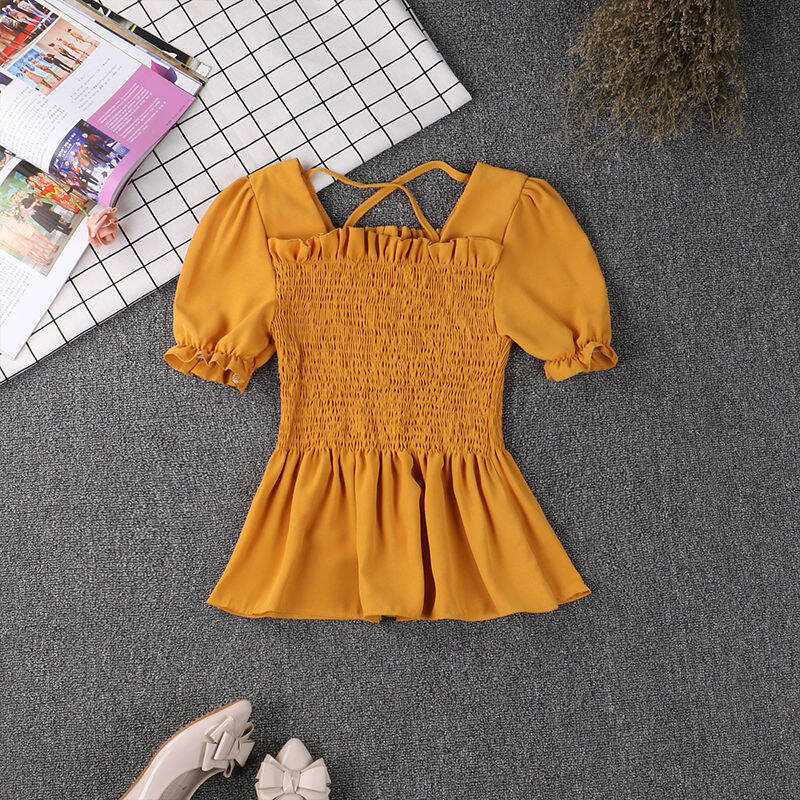 Wooden Ear Ruffle Skirt Swing Top 2019 Spring and Summer New Square Collar Puff Sleeve Waist Hugging Slimming Chiffon Shirt Women's Short Sleeve