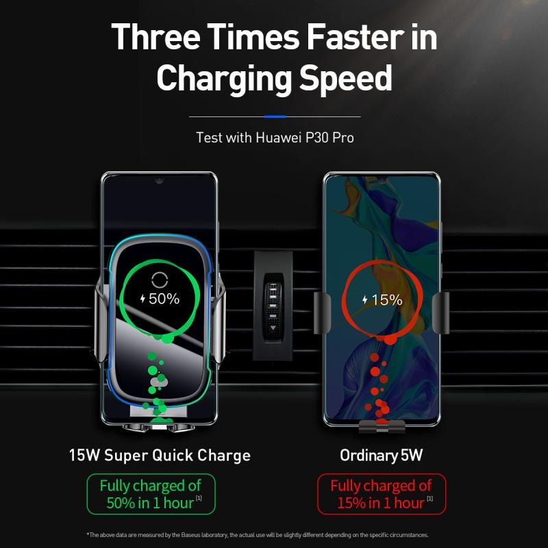BASEUS 15W Light Electric Dashboard / Air Vent Fast Wireless Charger Car Mount Phone Holder for iPhone 12 11 XS XR Pro Max Samsung Note 20 / Note 10 9 8 Plus Huawei P40 30 Pro -Black