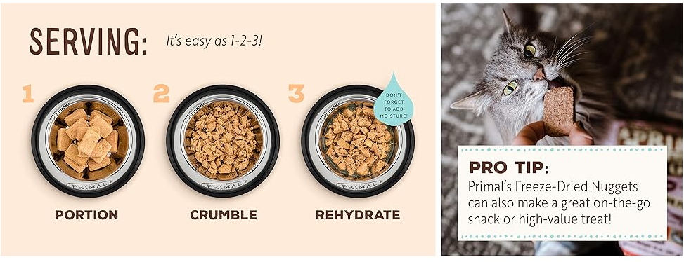 - Convenient & delicious raw nutrition. Shelf-stable, great alternative to frozen cat food. Easy to crumble and serve. Best when rehydrated to satisfy your feline’s natural instinct. 3-4 nuggets per oz